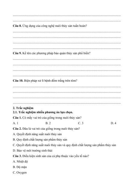 Câu 1. Có mấy vai trò của giống trong nuôi thủy sản? A. 1 B. 2 C. 3 D. 4