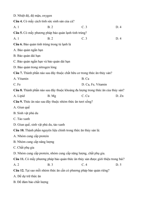 Câu 11. Có mấy phương pháp bảo quản thức ăn thủy sản được giới thiệu trong bài? A. 2 B. 3 C. 4 D. 5