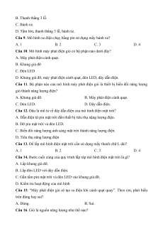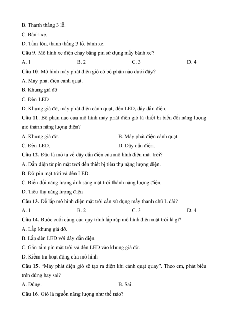 Câu 15. “Máy phát điện gió sẽ tạo ra điện khi cánh quạt quay”. Theo em, phát biểu trên đúng hay sai? A. Đúng. B. Sai.