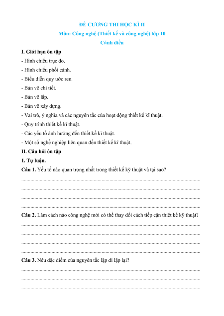 - Tailieugiaovien.com.vn giới thiệu bộ Đề cương ôn tập Cuối kì 2 Công nghệ 10 Thiết kế và công nghệ Cánh diều theo cấu trúc mới nhất nhằm giúp Giáo viên có thêm tài liệu tham khảo ra đề thi Công nghệ 10.