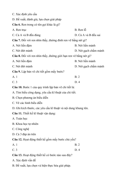 Câu 1. Quy trình thiết kế kĩ thuật gồm mấy bước? A. 1 B. 3 C. 5 D. 7