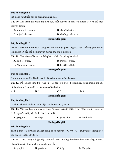 Câu 11. Chất nào dưới đây là thành phần chính của quặng bauxite? A. Iron(II) oxide. B. Iron(III) oxide. C. Aluminium oxide. D. Iron(II) sulfide. Hướng dẫn giải: Đáp án đúng là: C