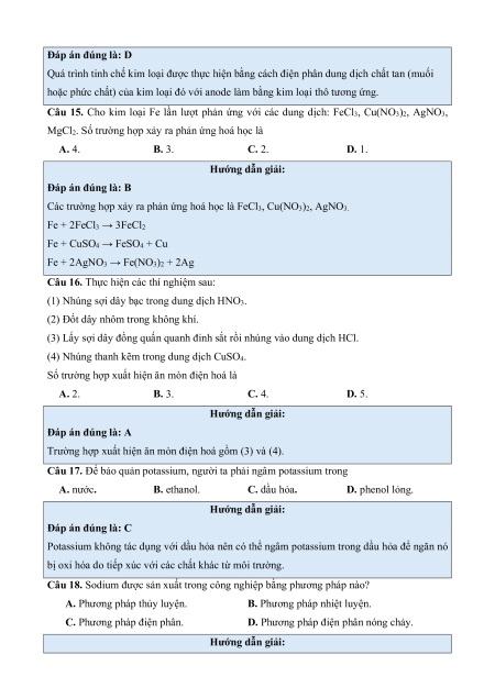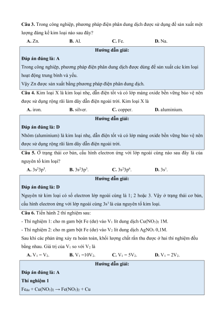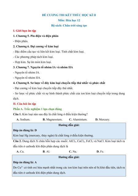 Câu 1. Kim loại nào sau đây là chất lỏng ở điều kiện thường? A. Sodium. B. Magnessium. C. Aluminium. D. Mercury. Hướng dẫn giải: Đáp án đúng là: D