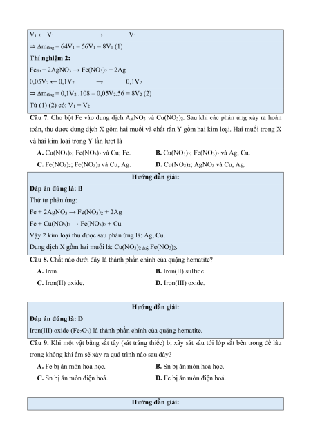 D. Cu(NO3)2; AgNO3 và Cu, Ag. Hướng dẫn giải: Đáp án đúng là: B Thứ tự phản ứng: Fe + 2AgNO3 → Fe(NO3)2 + 2Ag