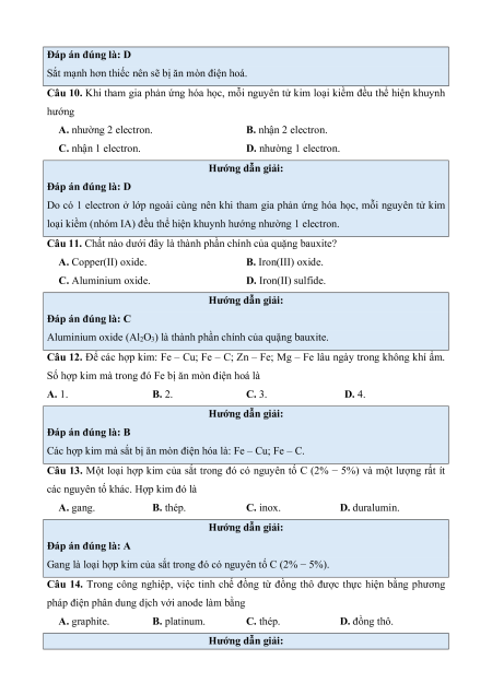 Câu 11. Chất nào dưới đây là thành phần chính của quặng bauxite? A. Copper(II) oxide. B. Iron(III) oxide. C. Aluminium oxide. D. Iron(II) sulfide. Hướng dẫn giải: Đáp án đúng là: C
