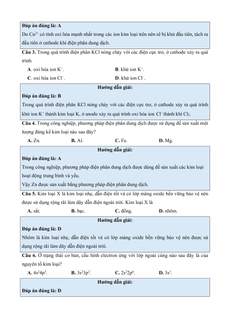 Câu 3. Trong quá trình điện phân KCl nóng chảy với các điện cực trơ, ở cathode xảy ra quá trình A. oxi hóa ion K+. B. khử ion K+. C. oxi hóa ion Cl–. D. khử ion Cl–. Hướng dẫn giải: Đáp án đúng là: B