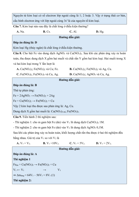Câu 7. Kim loại nào sau đây là chất lỏng ở điều kiện thường? A. Na. B. Cs. C. Al. D. Hg. Hướng dẫn giải: Đáp án đúng là: D