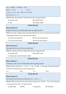 Câu 10. Chất nào dưới đây là thành phần chính của quặng hematite? A. Iron(II) oxide. B. Iron(III) oxide. C. Iron. D. Iron(II) sulfide. Hướng dẫn giải: Đáp án đúng là: B