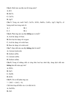 Câu 4. Muối nào sau đây tan tốt trong nước? A. KCl. B. BaCO3. C. CaCO3. D. AgCl.