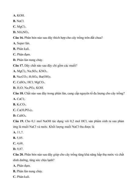 Câu 16. Phân bón nào sau đây thích hợp cho cây trồng trên đất chua? A. Super lân. B. Phân kali. C. Phân đạm.