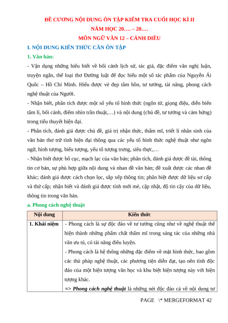Đề cương ôn tập Cuối kì 2 Ngữ văn 12 Cánh diều