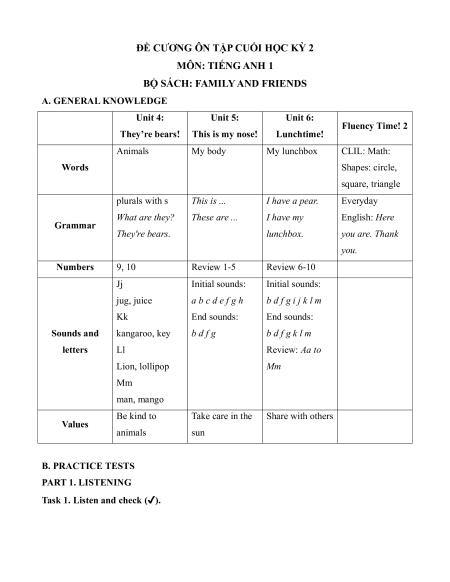 Đề cương ôn tập Cuối kì 2 Tiếng Anh 1 Family and friends