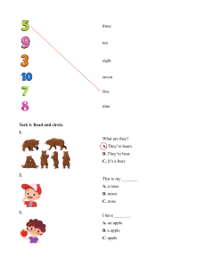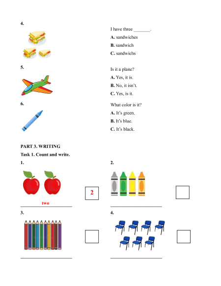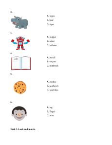 They’re bears! This is my nose! Lunchtime! Animals My body My lunchbox CLIL: Math: Words Shapes: circle, square, triangle plurals with s This is . . I have a pear. Everyday What are they? These are . . I have my English: Here Grammar They're bears. lunchbox. you are. Thank you. Numbers 9, 10 Review 1-5 Review 6-10 Jj Initial sounds: Initial sounds: jug, juice a b c d e f g h b d f g i j k l m Kk End sounds: End sounds: Sounds and kangaroo, key b d f g b d f g k l m letters Ll Review: Aa to Lion, lollipop Mm Mm man, mango Be kind to Take care in the Share with others Values animals sun B. PRACTICE TESTS PART 1. LISTENING
