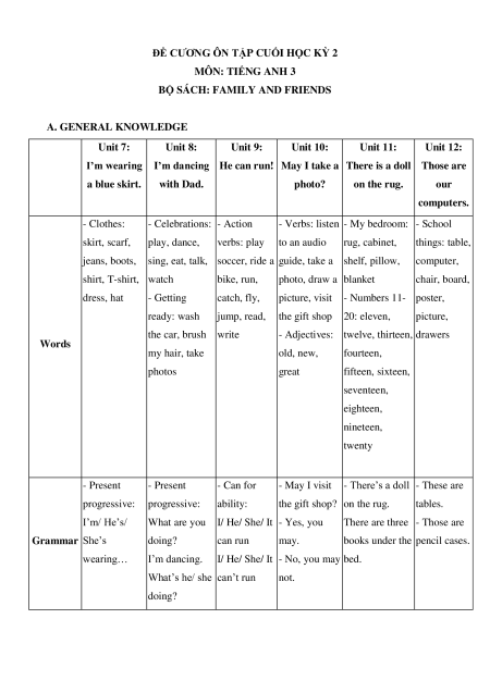 BỘ SÁCH: FAMILY AND FRIENDS A. GENERAL KNOWLEDGE Unit 7: Unit 8: Unit 9: Unit 10: Unit 11: Unit 12: