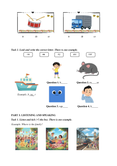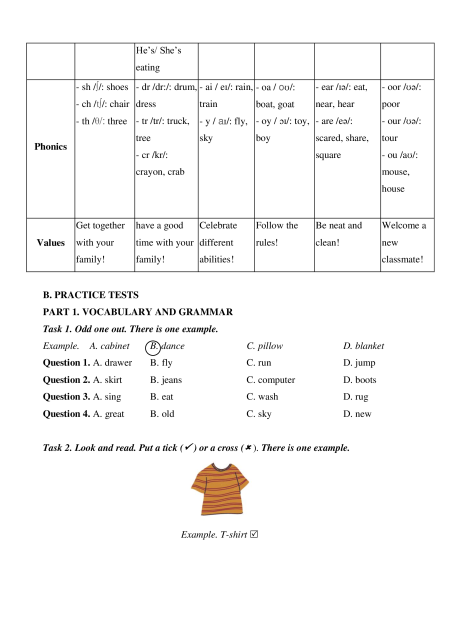 - th /θ/: three - tr /tr/: truck, - y / aɪ/: fly, - oy / ɔɪ/: toy, - are /eə/: - our /ʊə/: tree sky boy scared, share, tour Phonics - cr /kr/: square - ou /aʊ/: crayon, crab mouse, house Get together have a good Celebrate Follow the Be neat and Welcome a Values with your time with your different rules! clean! new family! family! abilities! classmate! B. PRACTICE TESTS