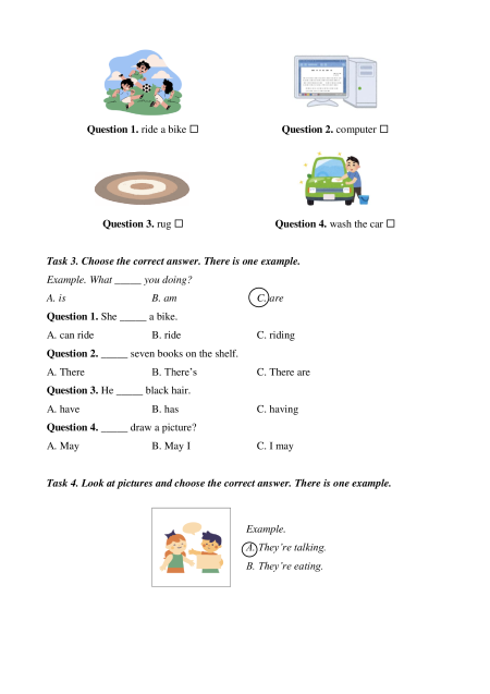 Task 4. Look at pictures and choose the correct answer. There is one example. Example. A. They’re talking. B. They’re eating. Question 1. Question 2. A. She’s wearing a T-shirt. A. The car is old. B. She’s wearing a dress. B. The car is new. Question 3. Question 4. A. These are chairs. A. There are toys in the box. B. Those are chairs.