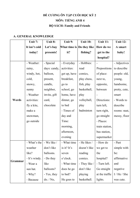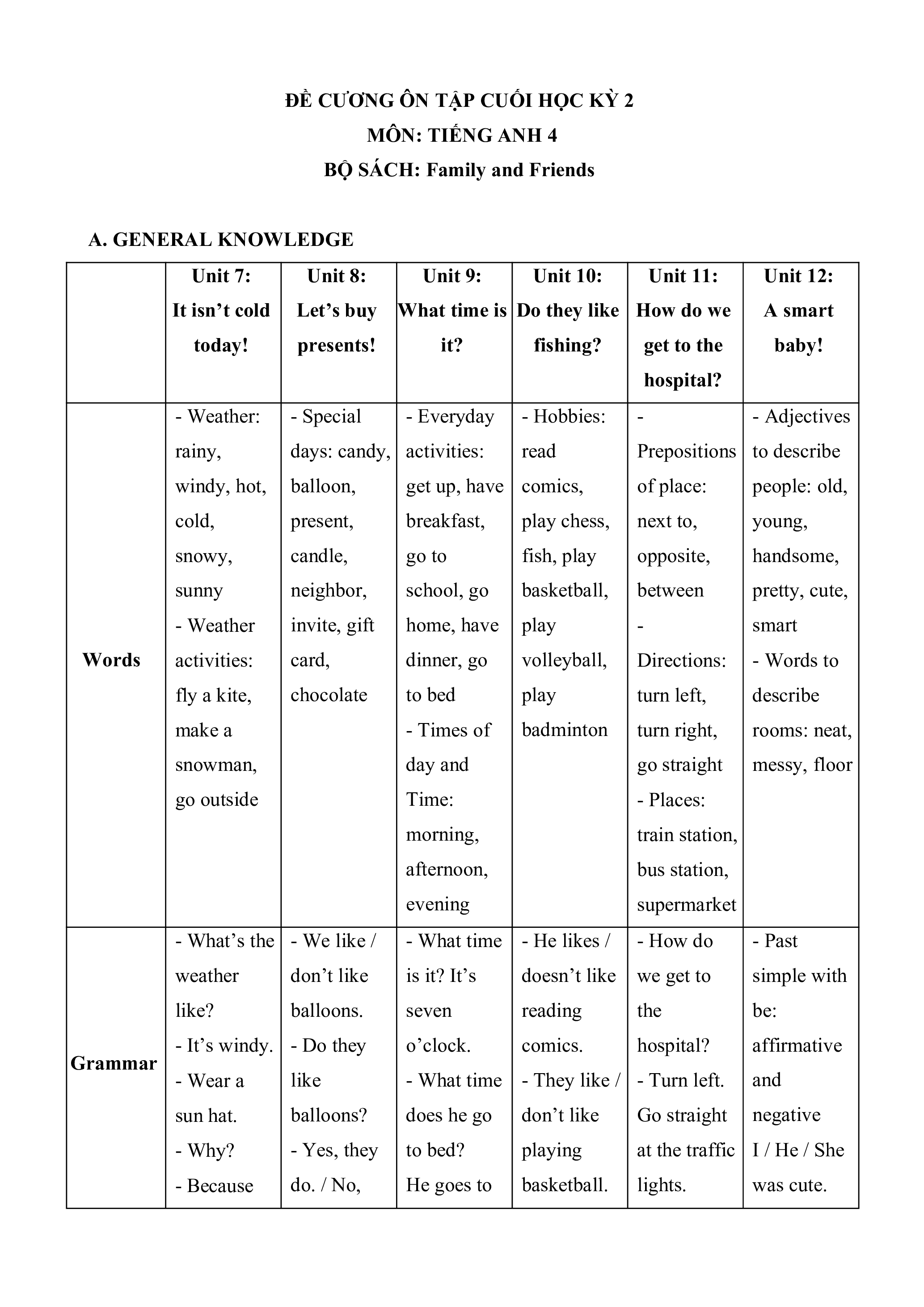 Đề cương ôn tập Cuối kì 2 Tiếng Anh 4 Family and Friends