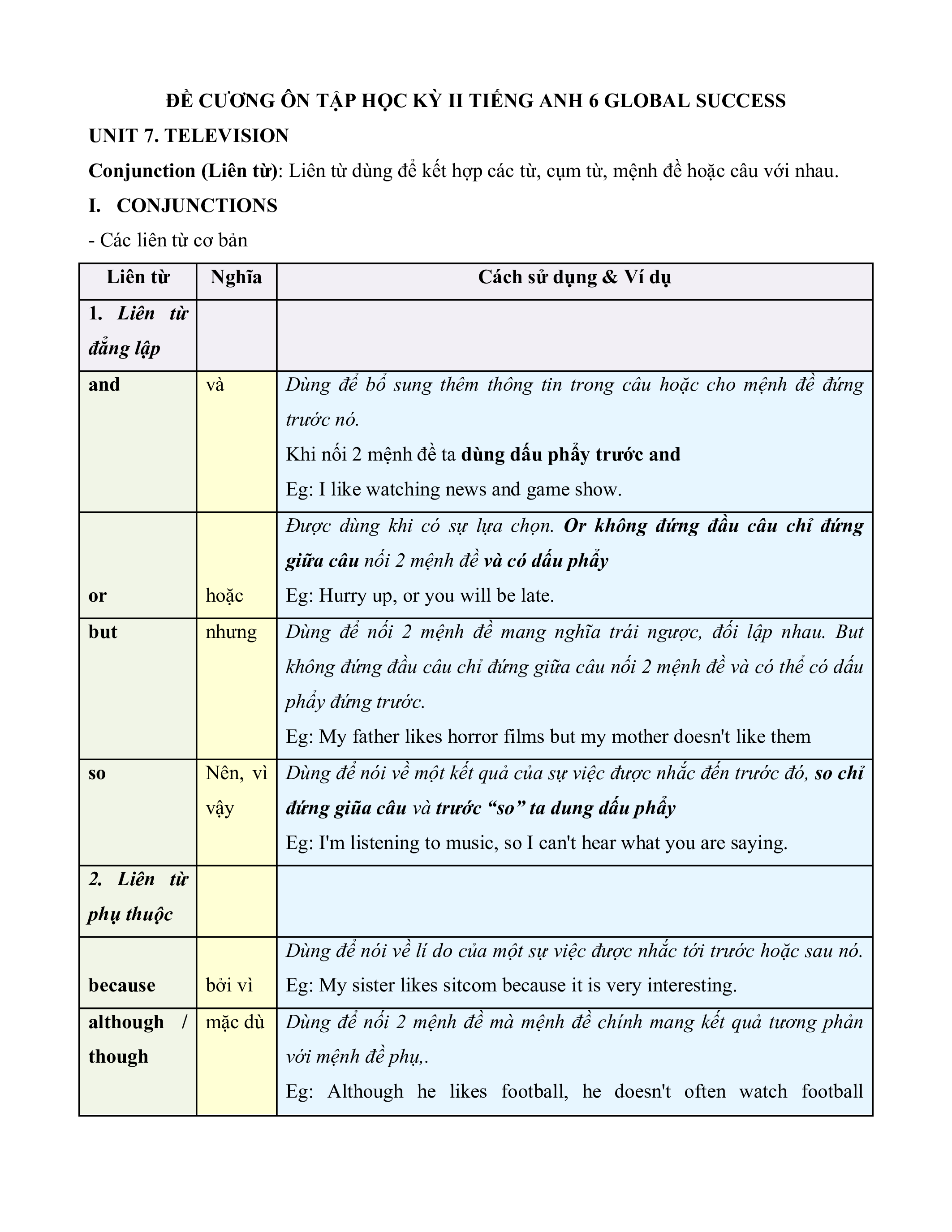 ĐỀ CƯƠNG ÔN TẬP HỌC KỲ II TIẾNG ANH 6 GLOBAL SUCCESS UNIT 7. TELEVISION