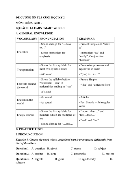 ĐỀ CƯƠNG ÔN TẬP CUỐI HỌC KỲ 2 MÔN: TIẾNG ANH 7