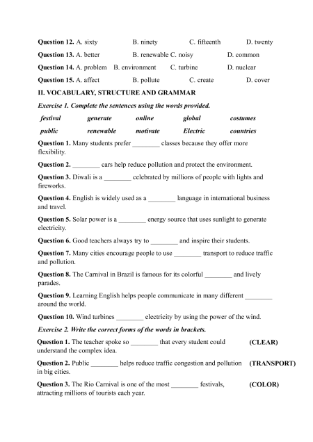 Question 11. A. thirteen B. fifteen C. thirty D. fourteen Question 12. A. sixty B. ninety C. fifteenth D. twenty Question 13. A. better B. renewable C. noisy D. common
