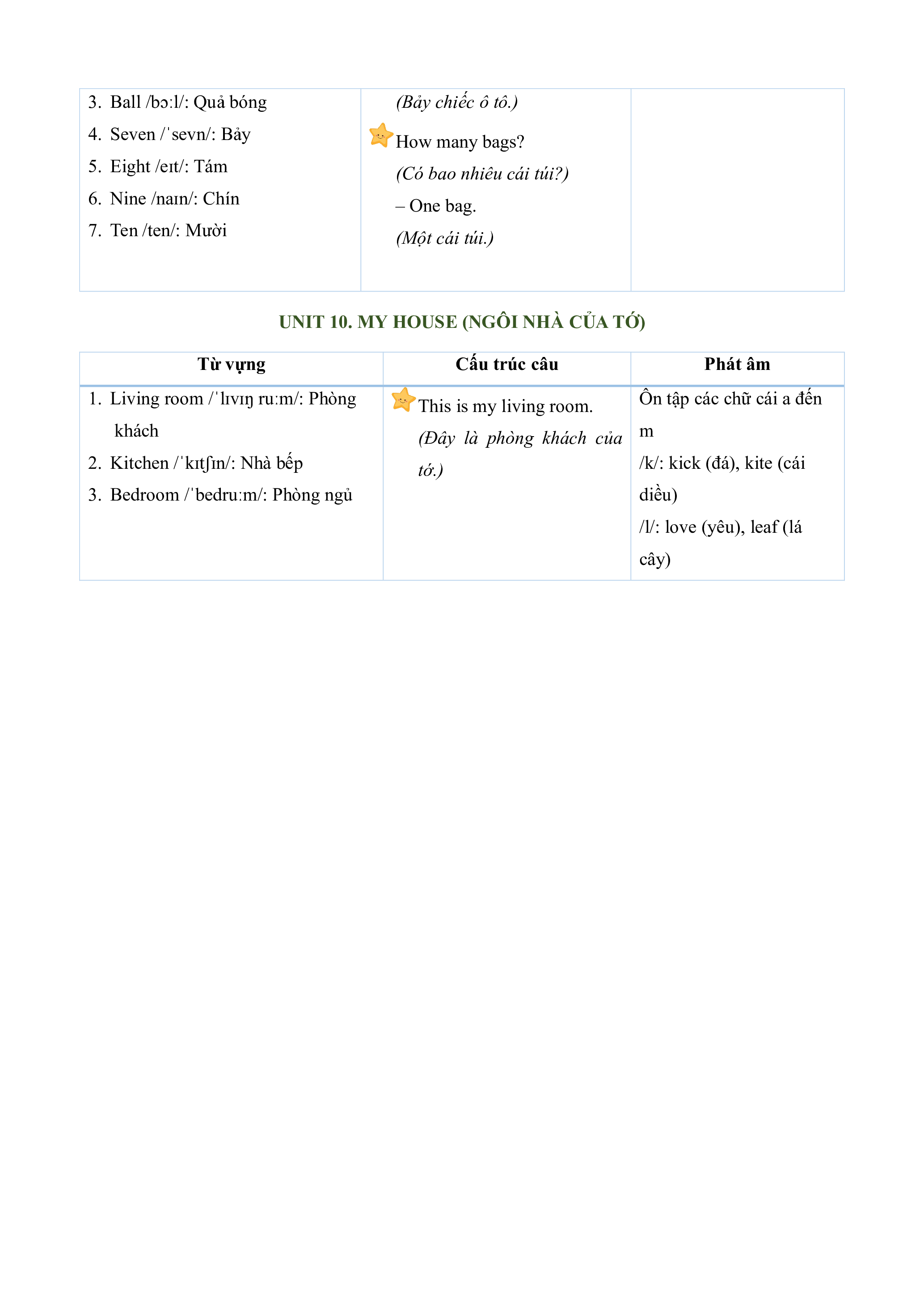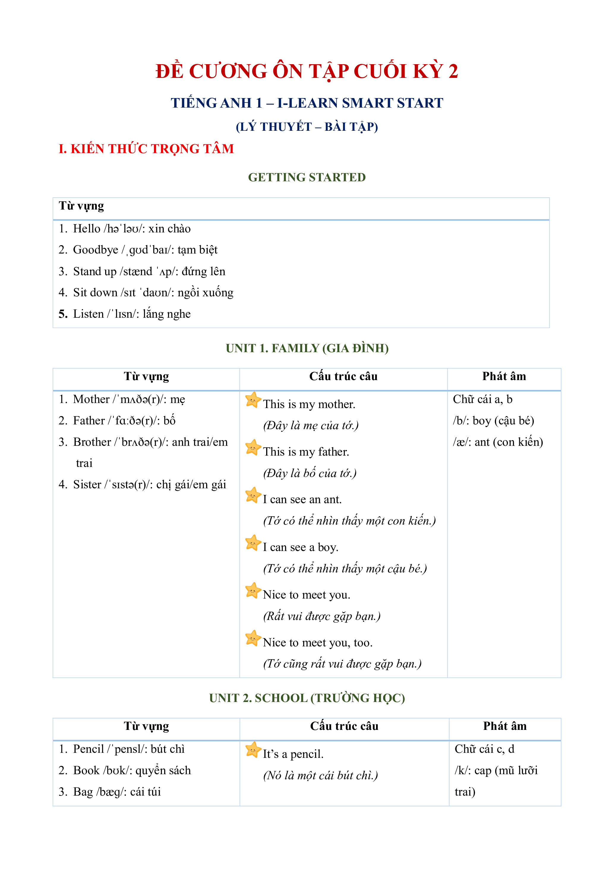 Đề cương ôn tập Cuối kì 2 Tiếng Anh lớp 1 iLearn Smart Start