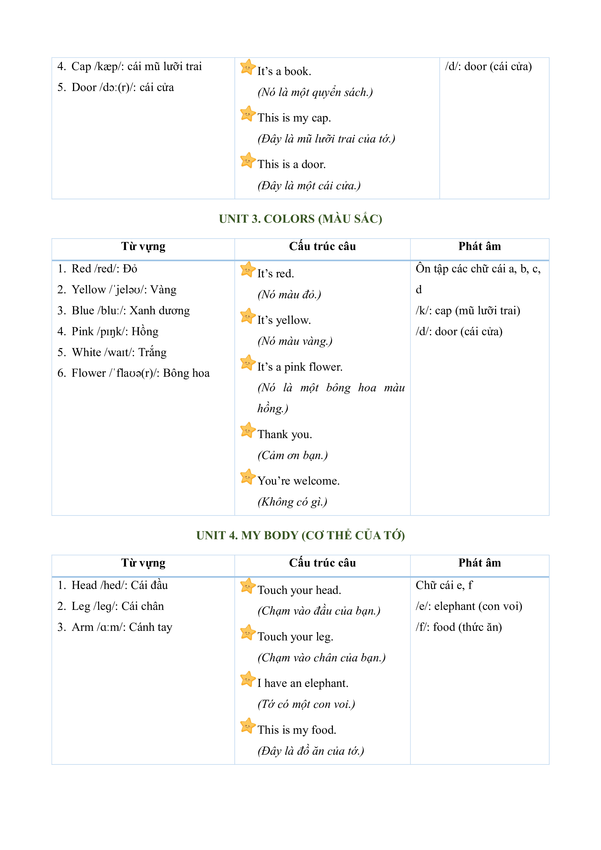 UNIT 4. MY BODY (CƠ THỂ CỦA TỚ) Từ vựng Cấu trúc câu Phát âm 1. Head /hed/: Cái đầu Touch your head. Chữ cái e, f 2. Leg /leɡ/: Cái chân
