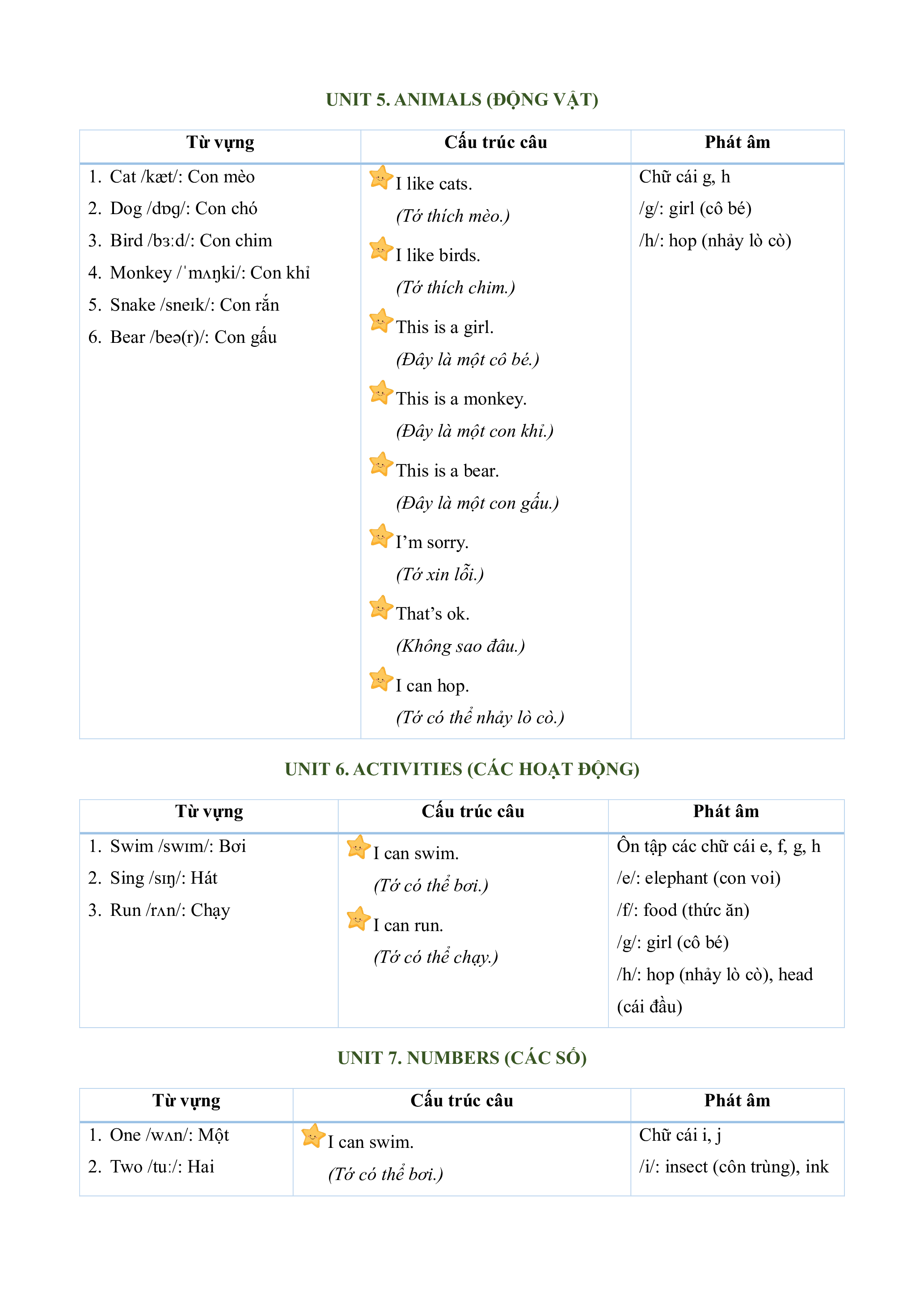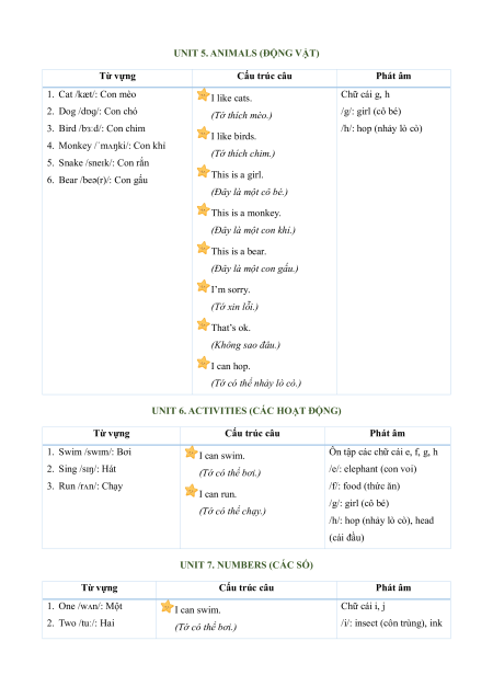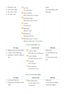 UNIT 7. NUMBERS (CÁC SỐ) Từ vựng Cấu trúc câu Phát âm 1. One /wʌn/: Một I can swim. Chữ cái i, j 2. Two /tuː/: Hai (Tớ có thể bơi.) /i/: insect (côn trùng), ink 3. Three /θriː/: Ba I can run. (mực) 4. Four /fɔː(r)/: Bốn