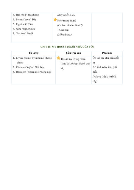 UNIT 9. TOYS (ĐỒ CHƠI) Từ vựng Cấu trúc câu Phát âm 1. Car /kɑː(r)/: Xe ô tô How many cars? Chữ cái m