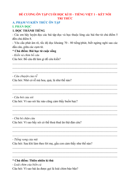 ĐỀ CƯƠNG ÔN TẬP CUỐI HỌC KÌ II – TIẾNG VIỆT 1 – KẾT NỐI TRI THỨC