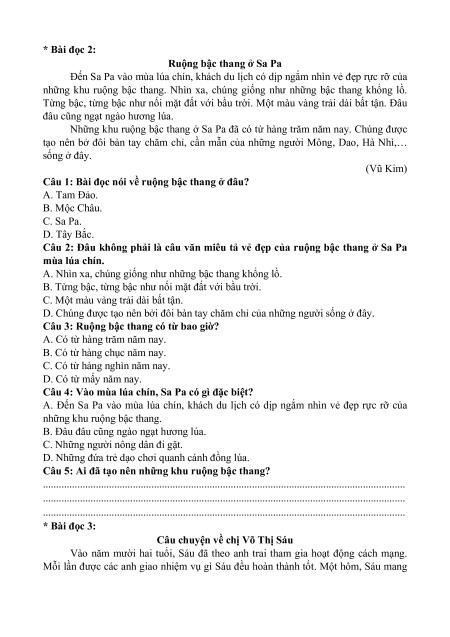 Câu 1: Bài đọc nói về ruộng bậc thang ở đâu? A. Tam Đảo. B. Mộc Châu. C. Sa Pa. D. Tây Bắc.