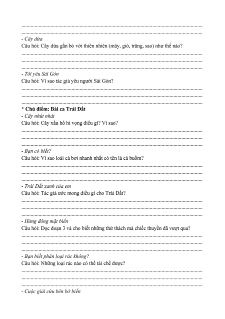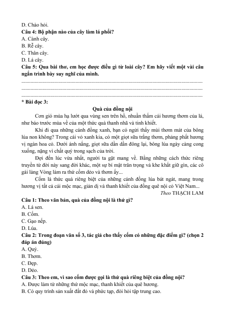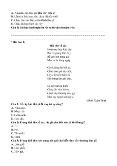 . . . . . . . . . . . . . . . . . . . . . . . . . . . . . . . . . . . . . . . . . . . . . . . . . . . . . . . . . . . . . . . . . . . . . * Bài đọc 2: Bài thơ về cây Hôm nay học loài cây, Bài cô giảng thật hay: Rễ cây hút nhựa đất Như ta ăn hàng ngày. Cây không hề biết đi, Chưa bao giờ cây nói, Cây chỉ biết thầm thì Khi trăng lên gió thổi. Lá cây làm lá phổi Cũng hít vào, thở ra.