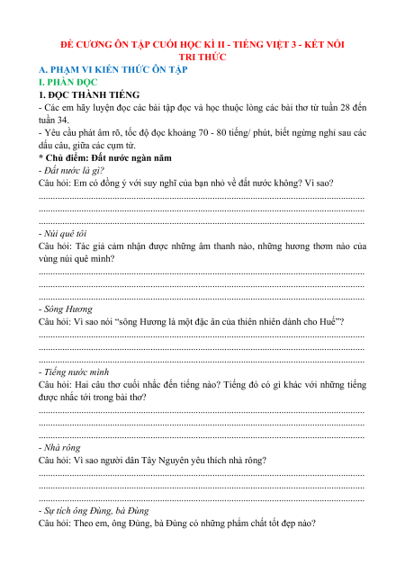 ĐỀ CƯƠNG ÔN TẬP CUỐI HỌC KÌ II - TIẾNG VIỆT 3 - KẾT NỐI TRI THỨC
