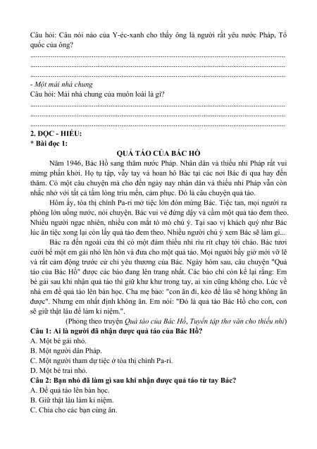 Câu 1: Ai là người đã nhận được quả táo của Bác Hồ? A. Một bé gái nhỏ. B. Một người dân Pháp.