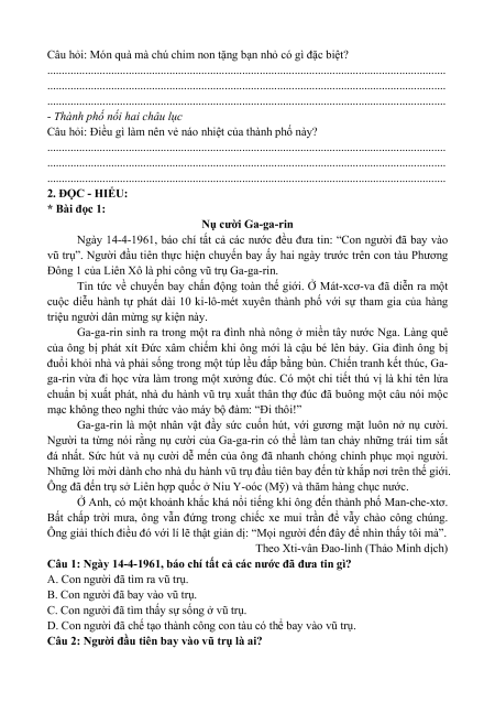 . . . . . . . . . . . . . . . . . . . . . . . . . . . . . . . . . . . . . . . . . . . . . . . . . . . . . . . . . . . . . . . . . . . . . 2. ĐỌC - HIỂU: * Bài đọc 1: Nụ cười Ga-ga-rin