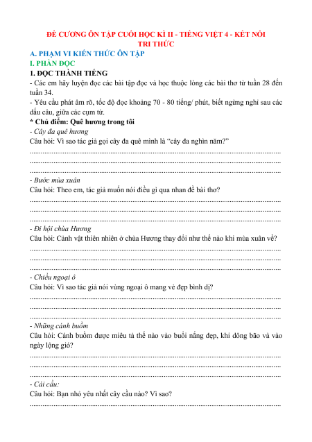 ĐỀ CƯƠNG ÔN TẬP CUỐI HỌC KÌ II - TIẾNG VIỆT 4 - KẾT NỐI TRI THỨC
