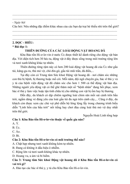 Câu 4: Loài vật nào không được nhắc đến trong đoạn văn cuối? A. Gấu túi. B. Chim săn mồi. C. Vẹt. D. Linh dương.