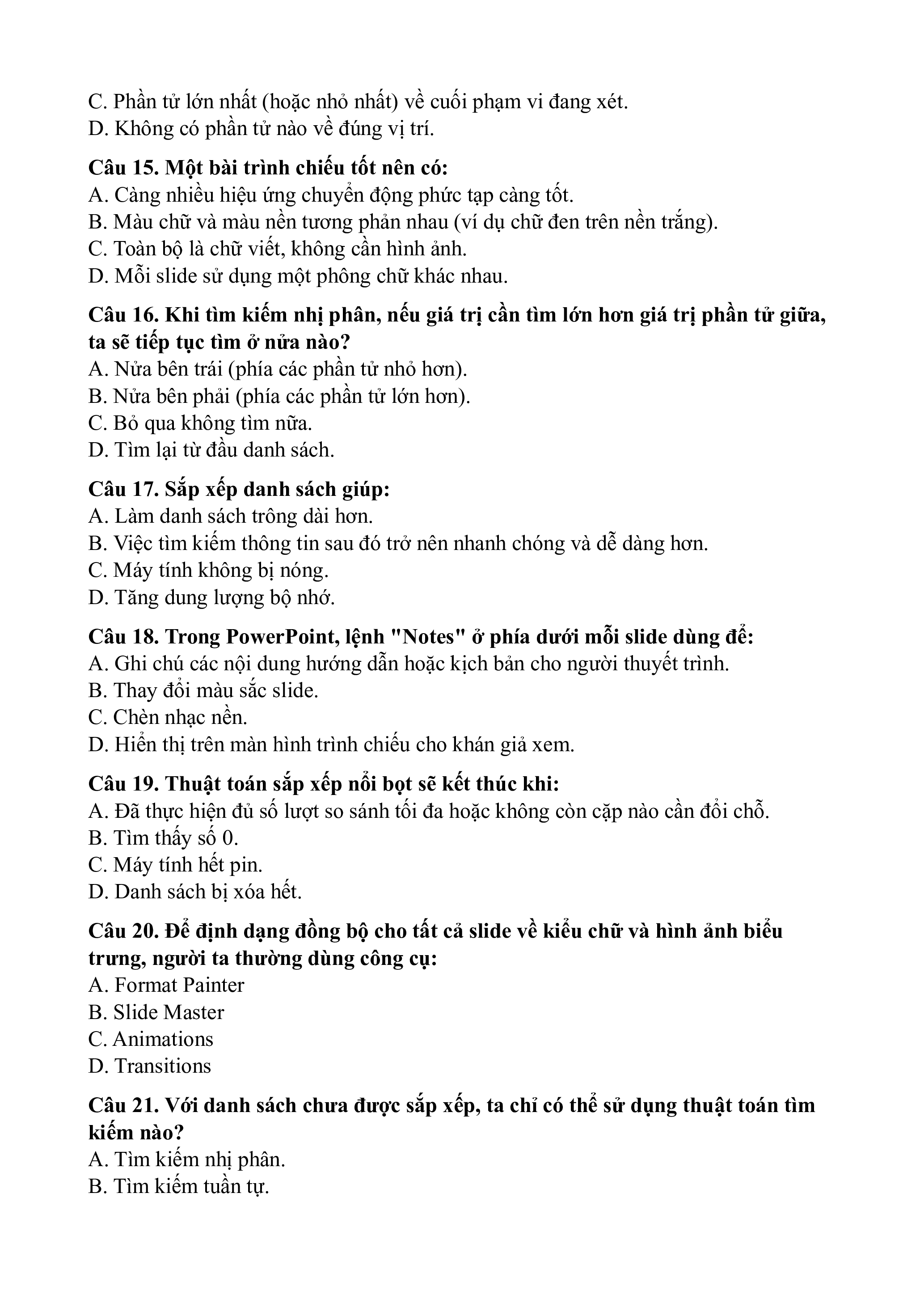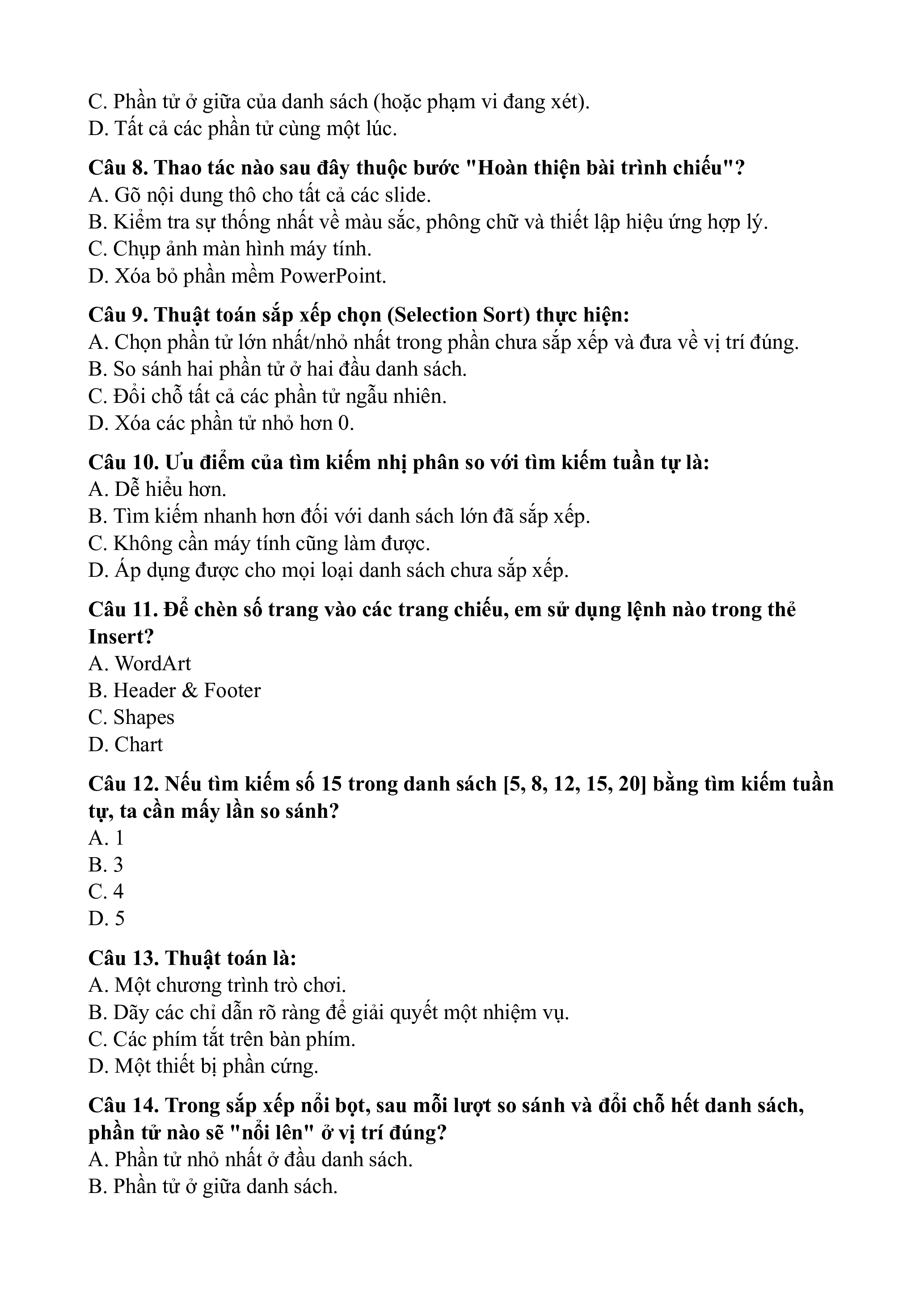 Câu 14. Trong sắp xếp nổi bọt, sau mỗi lượt so sánh và đổi chỗ hết danh sách,