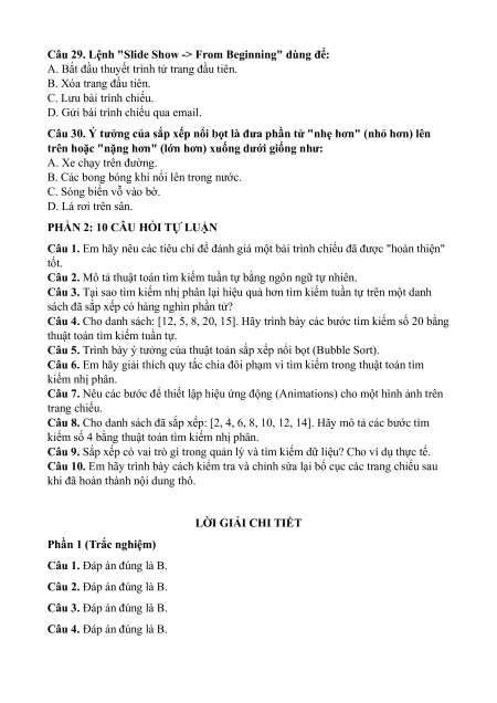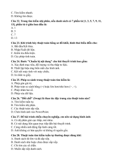Câu 21. Với danh sách chưa được sắp xếp, ta chỉ có thể sử dụng thuật toán tìm kiếm nào? A. Tìm kiếm nhị phân. B. Tìm kiếm tuần tự. C. Tìm kiếm nhanh. D. Không tìm được.