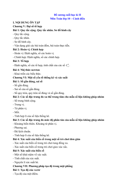 Môn Toán lớp 10 – Cánh diều I. NỘI DUNG ÔN TẬP