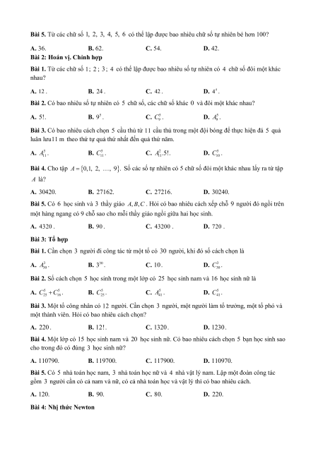 một hàng ngang có 9 chỗ sao cho mỗi thầy giáo ngồi giữa hai học sinh. A. 4320 . B. 90 . C. 43200 . D. 720 . Bài 3: Tổ hợp