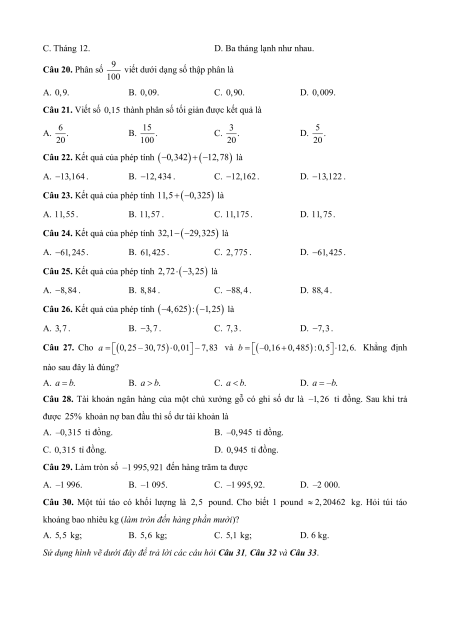 Câu 21. Viết số 0,15 thành phân số tối giản được kết quả là A. 6 . B. 15 . C. 3 . D. 5 . 20 100 20 20