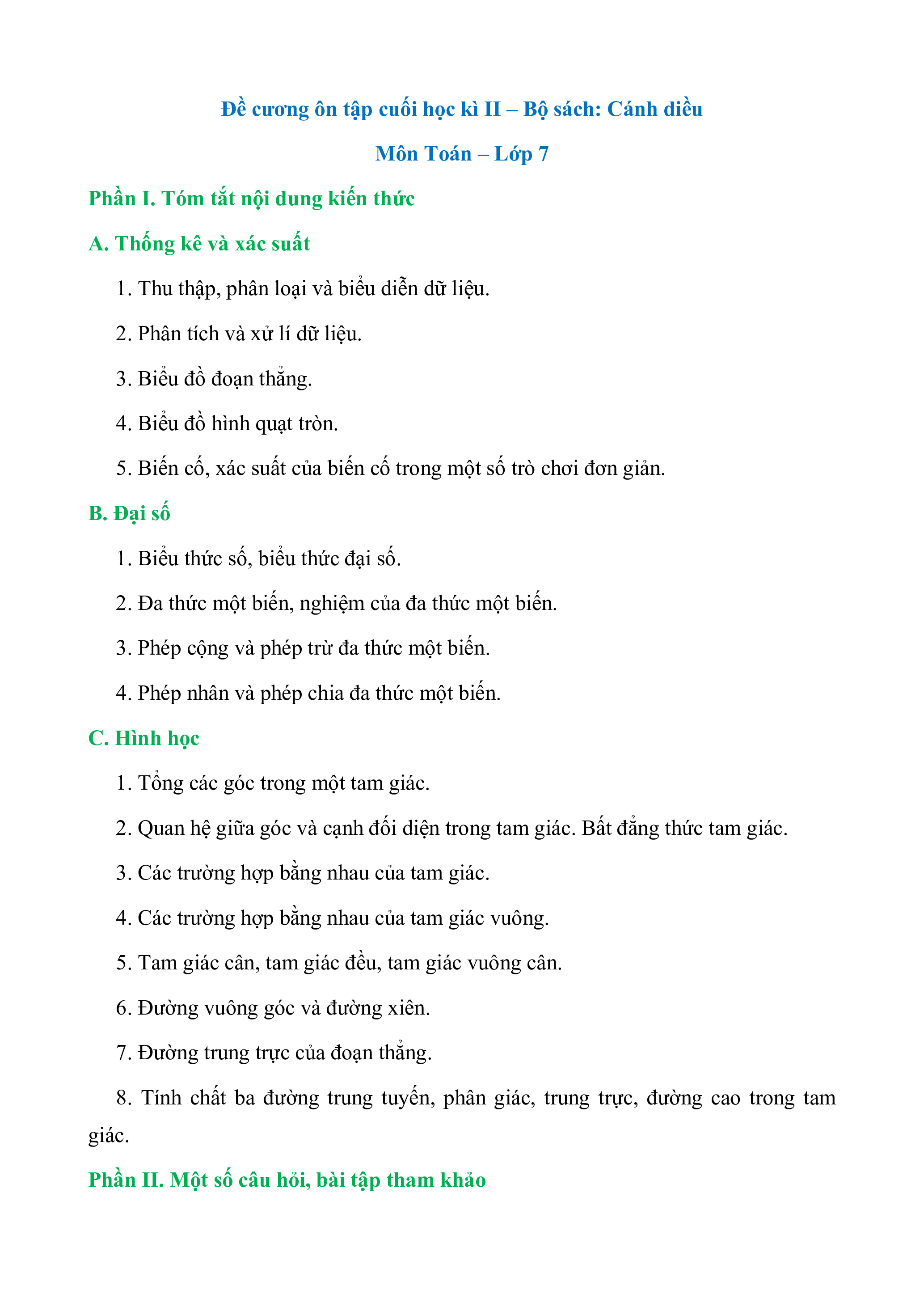 Đề cương ôn tập cuối học kì II – Bộ sách: Cánh diều Môn Toán – Lớp 7