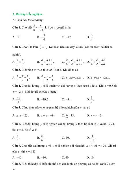 Câu 7. Cho biết đại lượng x và y tỉ lệ nghịch với nhau khi x 4 thì y 20. Giá trị