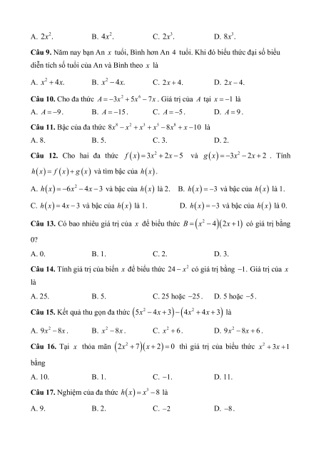 diễn tích số tuổi của An và Bình theo x là A. 2 x 4 .x B. 2 x 4 .x C. 2x 4. D. 2x 4. Câu 10. Cho đa thức 2 6
