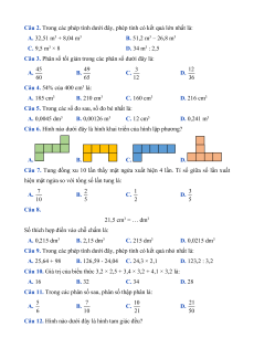 Câu 2. Trong các phép tính dưới đây, phép tính có kết quả lớn nhất là: A. 32,51 m3 + 8,04 m3 B. 51,2 m3 – 26,8 m3 C. 9,5 m3 × 8 D. 34 m3 : 2,5