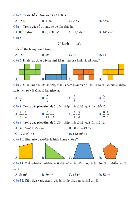 Câu 4. Trong các số đo sau, số đo lớn nhất là: A. 0,012 dm3 B. 0,0034 m3 C. 21,5 dm3 D. 345 cm3 Câu 5. 54 km/h = … m/s