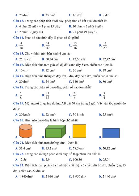 Câu 21. Diện tích hình tròn đường kính 10 cm là: A. 31,4 cm2 B. 15,2 cm2 C. 78,5 cm2 D. 50,12 cm2