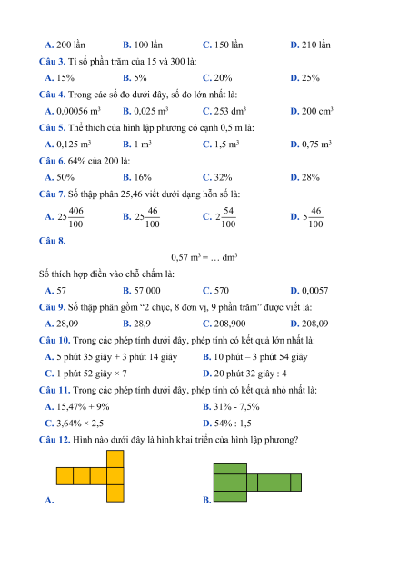 Câu 4. Trong các số đo dưới đây, số đo lớn nhất là: A. 0,00056 m3 B. 0,025 m3 C. 253 dm3 D. 200 cm3