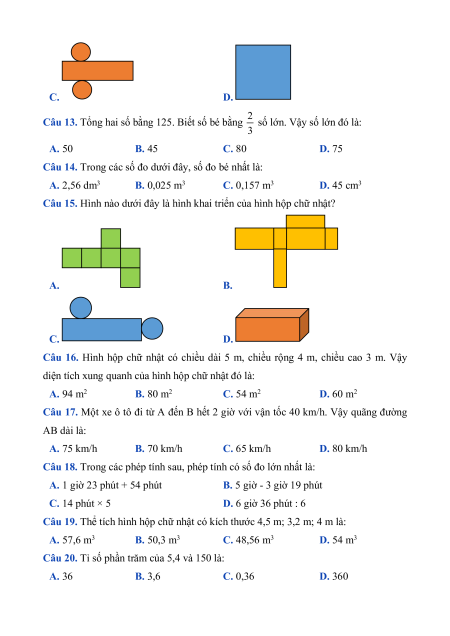 Câu 13. Tổng hai số bằng 125. Biết số bé bằng 2 số lớn. Vậy số lớn đó là: 3 A. 50 B. 45 C. 80 D. 75