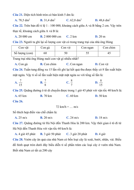 Câu 21. Diện tích hình tròn có bán kính 5 dm là: A. 78,5 dm2 B. 31,4 dm2 C. 62,8 dm2 D. 48,6 dm2